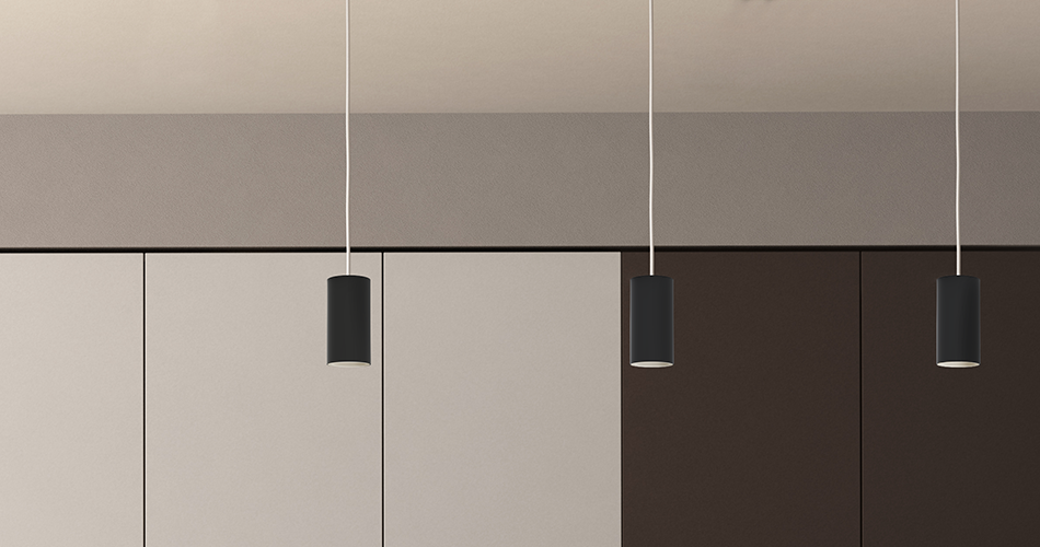 Suspended ceiling luminaire, decorative, simple shapes, made with metal.