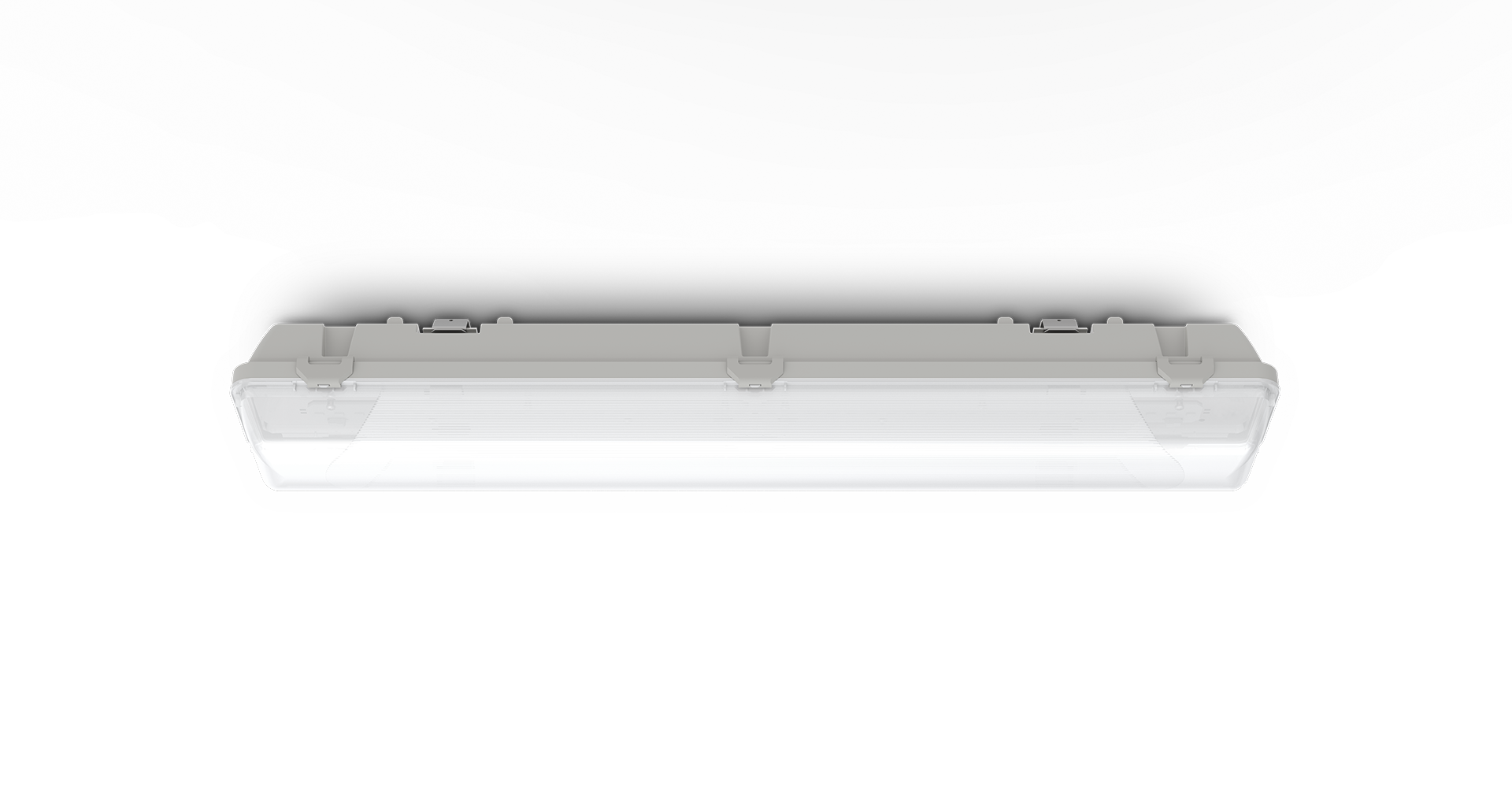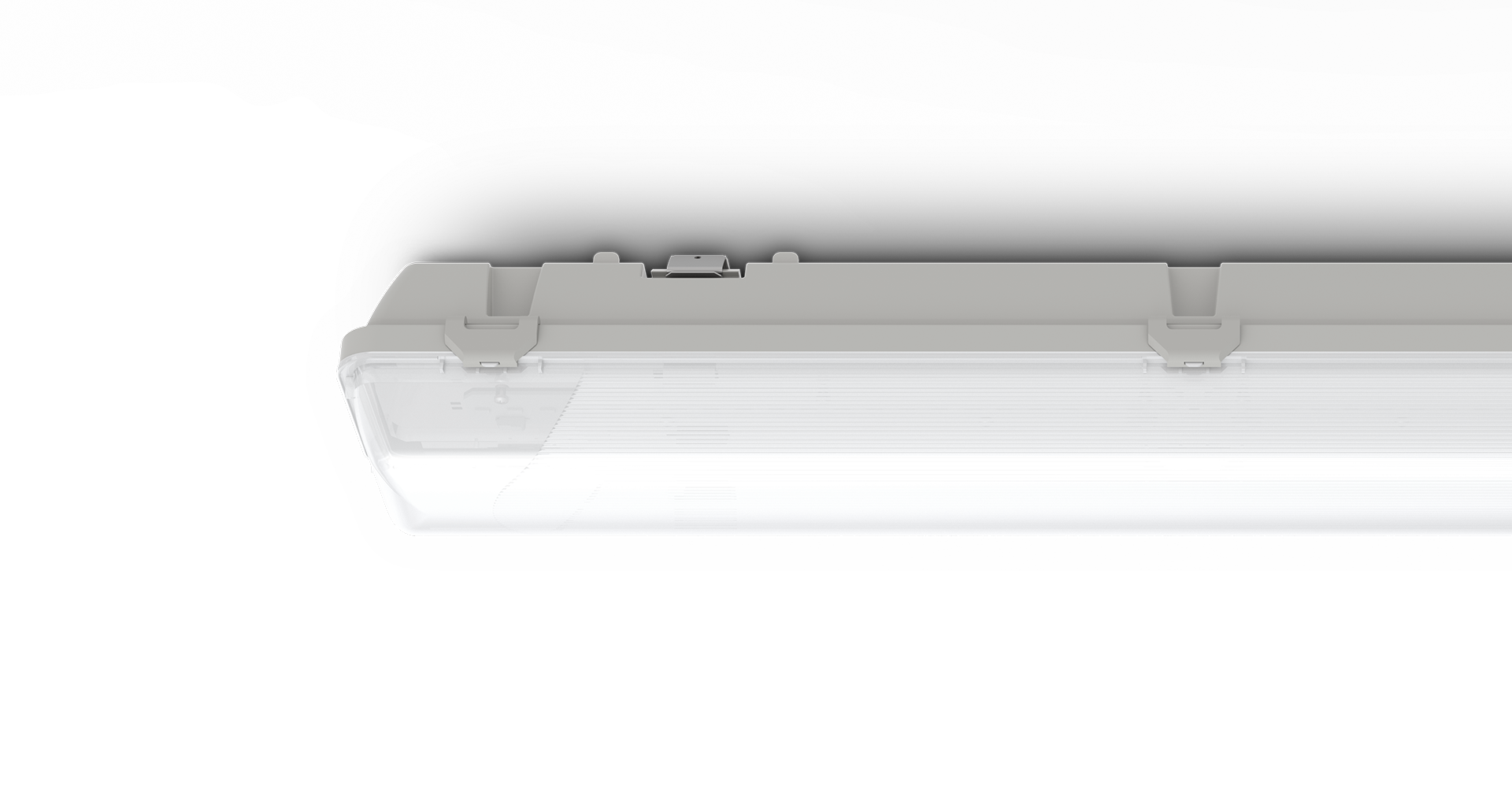 Luminária de montagem saliente para iluminação direta, corpo produzido em policarbonato com difusor em policarbonato translúcido.
