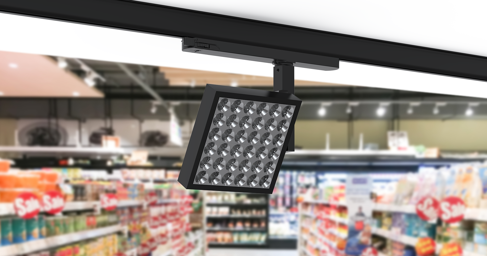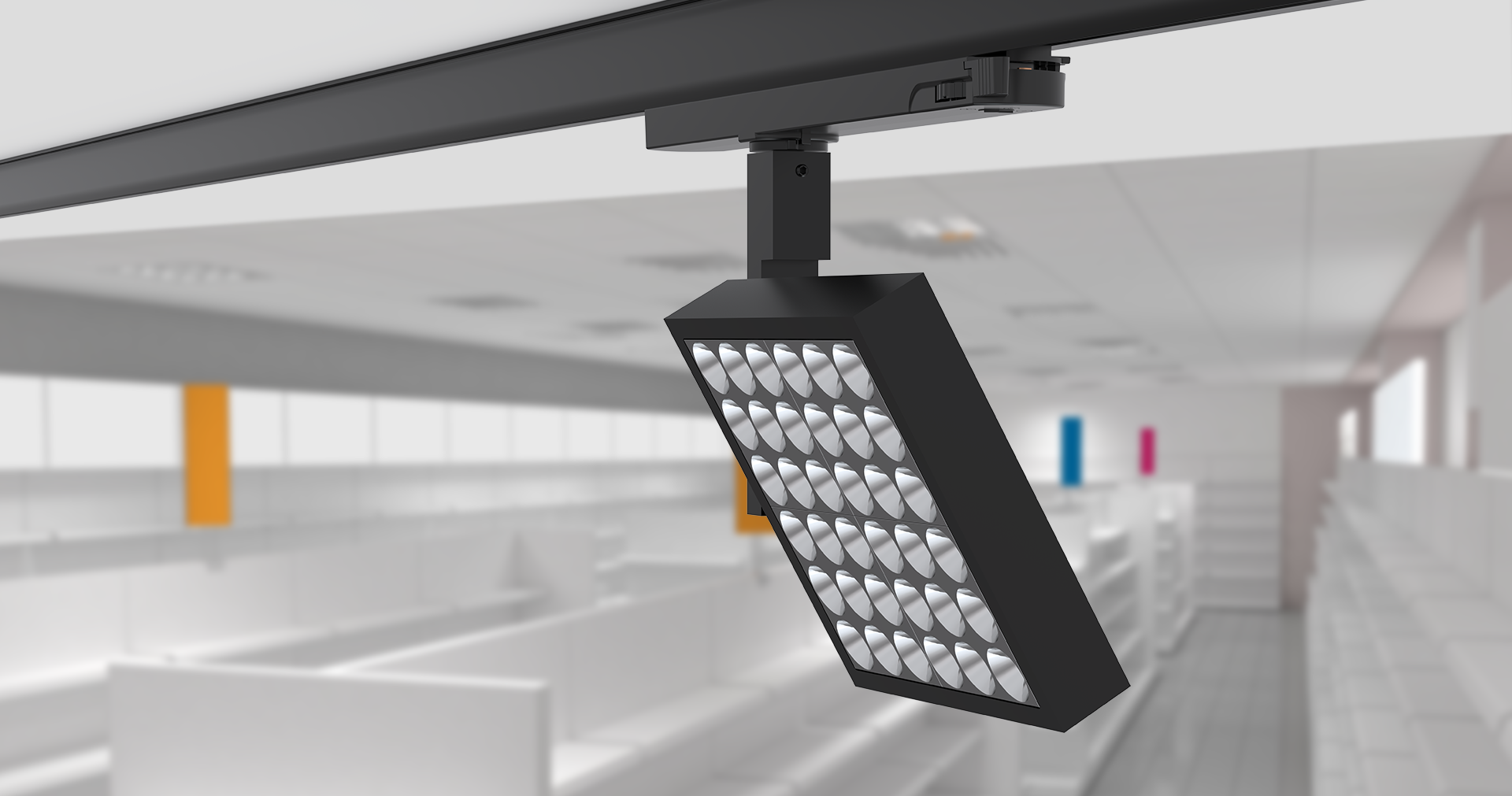 Projetor para calha trifásica de design minimalista, que combina a performance de uma ótica constituida por refletor brilhante e difusor translúcido com conforto visual.