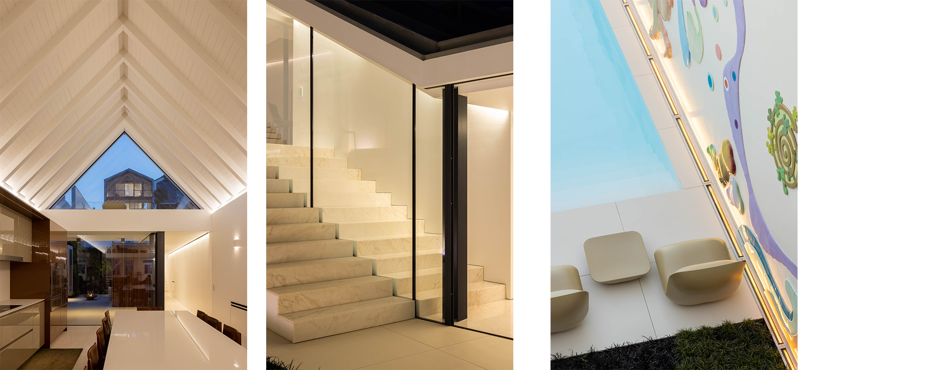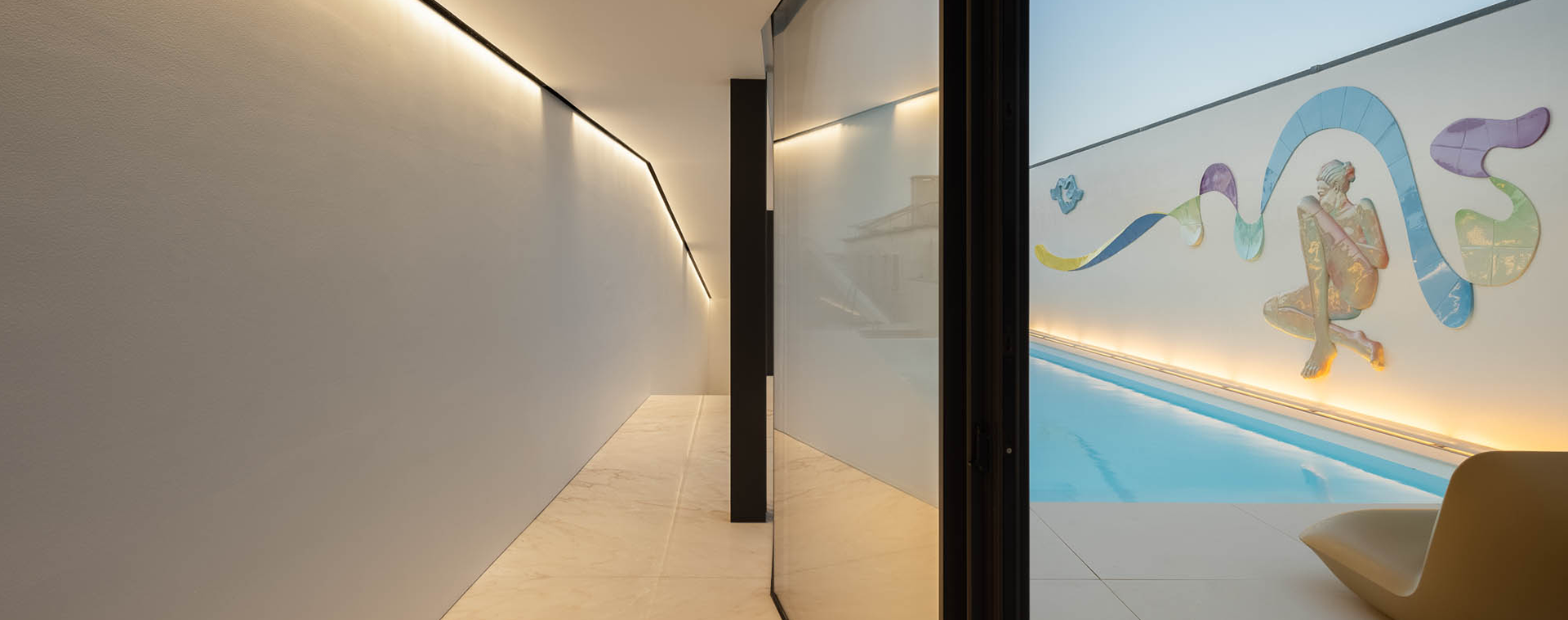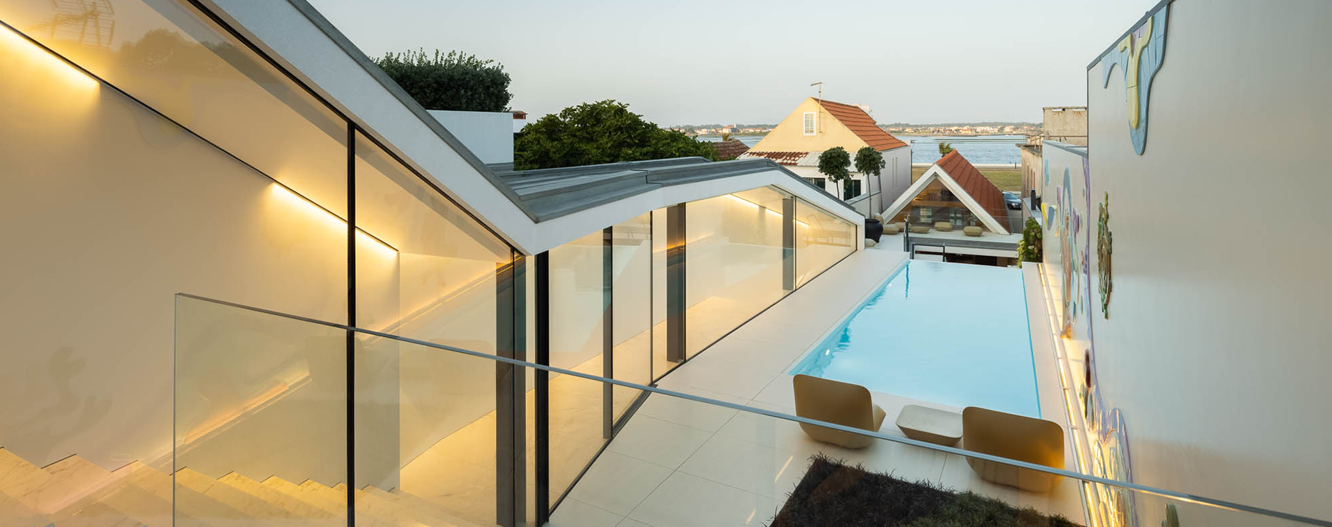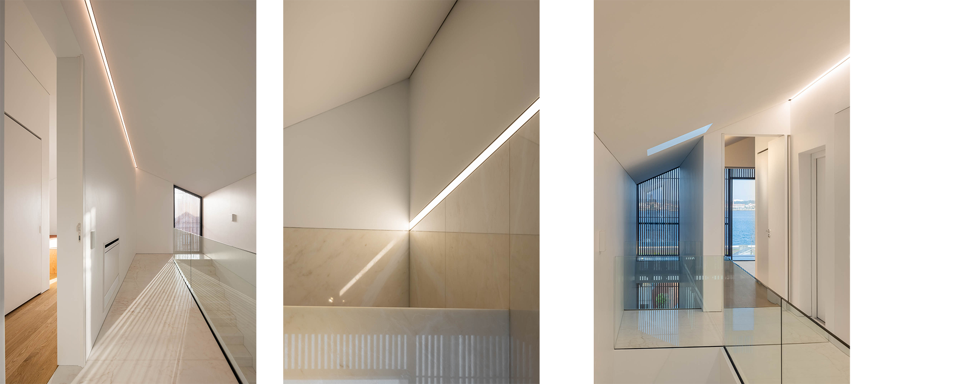 A escolha criteriosa dos sistemas de iluminação da Exporlux permitiu criar diferentes atmosferas ao longo do percurso arquitetónico, realçando o caráter dos espaços interiores e exteriores, e contribuindo para a leitura noturna da casa como uma extensão da paisagem costeira onde se insere. A luz atua aqui como elemento de coesão entre passado e presente, entre o gesto arquitetónico e a experiência quotidiana.