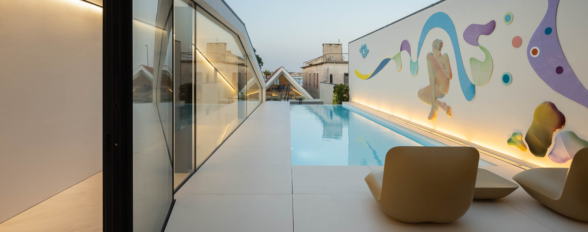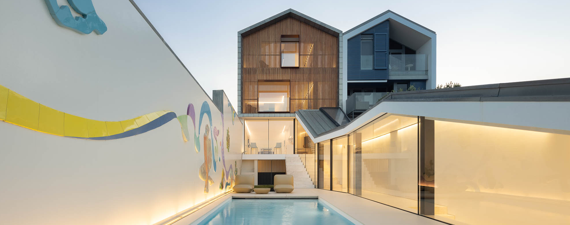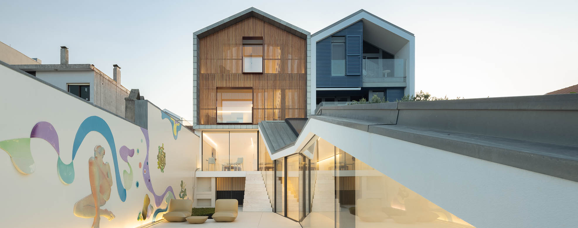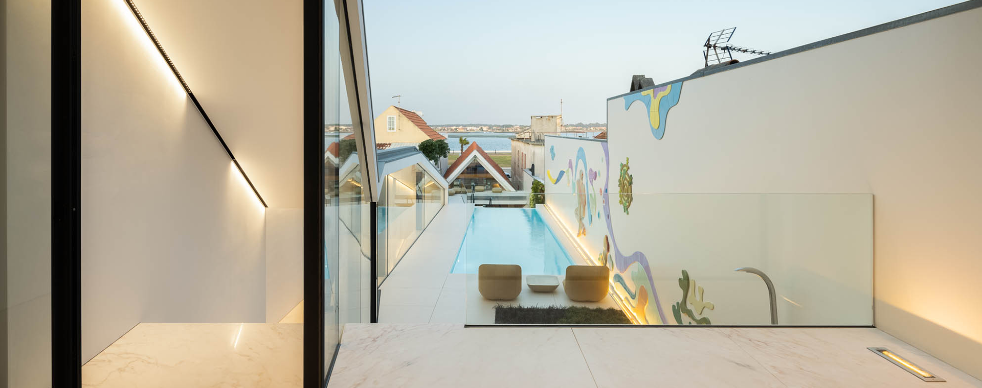 O projeto nasce do desejo do proprietário em transformar uma construção pré-existente, não diretamente associada aos tradicionais “palheiros” da Costa Nova, numa habitação unifamiliar de tipologia T4. Com frente para a emblemática Avenida José Estêvão e confrontando também com a Avenida da Bela Vista, o lote foi inteligentemente reorganizado, conjugando o edifício original com um novo volume arquitetónico. A articulação entre os dois corpos revelou-se um exercício sofisticado de composição e funcionalidade, onde a introdução de percursos, pátios e espaços abertos, como o jardim vertical, a piscina e o mural cerâmico do escultor António Nobre, contribuem para uma vivência rica e sensorial do espaço.